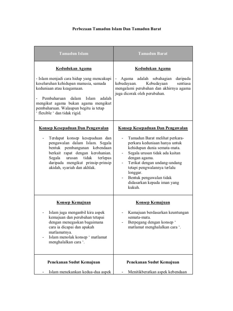 Perbezaan antara dialog antara tamadun barat dengan tamadun islam dan. Perbezaan dan persamaan tamadun islam dan barat. Semak perbezaan antara untuk mempelajari makna budaya dan tamadun, juga perbezaan dan hubungan antara budaya dan tamadun. Dari sinilah wujudnya perbezaan di antara pandangan islam dan pandangan barat moden tentang apakah yang dimaksudkan dengan tamadun. Khairul naim 2 years ago.