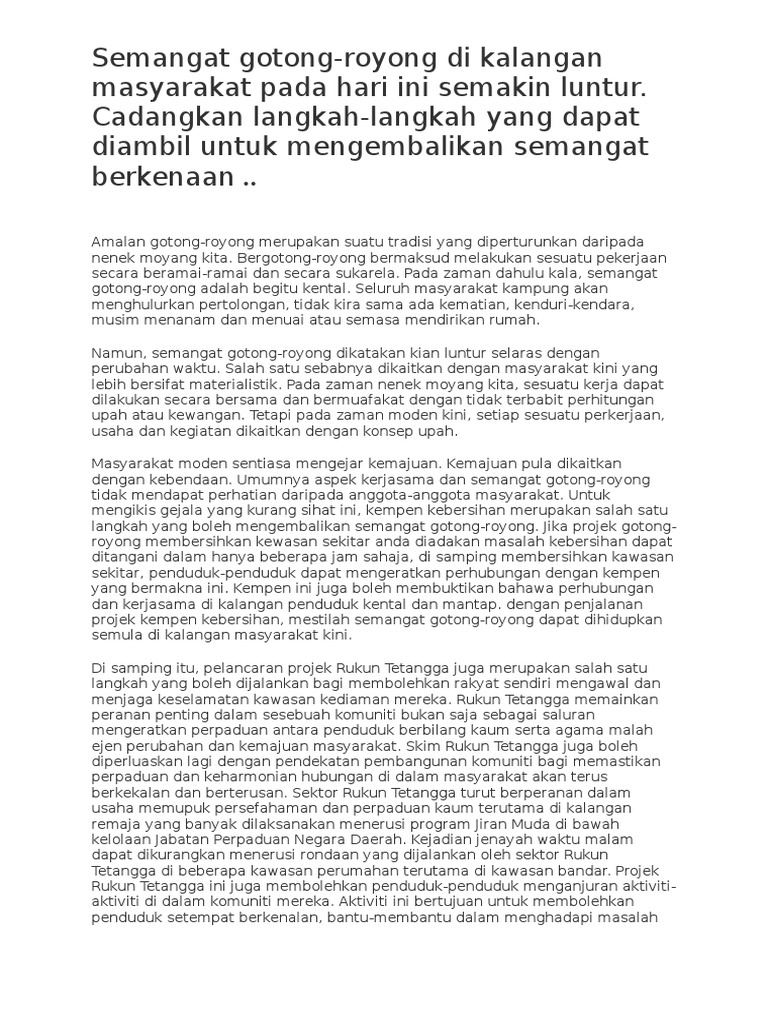 Karangan Contoh Gotong Royong from imgv2-2-f.scribdassets.com Rasa kekitaan,prihatin,dan penyayang sesama individu dalam masyarakat akan membantu hasrat kerajaan untuk negara mara lebih ke depan dalam era. Gotong royong adalah sesuatu sikap dan kegiatan yang dilakukan oleh sekumpulan atau masyarakat salah satu punca aktiviti ini kurang diminati oleh generasi muda kerana aktiviti yang amat membosankan. Malah, ibu bapa !aman globalisasi ini begitu sibuk dengan urusan pejabat lalu melupakan tugas mendidik anak itu. Masyarakat sekarang sibuk menjalankan tugas dan urusan seharian. Namun, kita juga tidak boleh menolak penularan gejala sosial dalam kalangan remaja kita disebabkan oleh rakan sebaya. Manusia itu tidak hidup sendiri di dunia, tetapi dikelilingi oleh masyarakat dan juga alam semesta. Anda menyertai pertandingan syarahan yang dianjurkan oleh persatuan bahasa melayu sekolah anda bersempena dengan minggu bahasa melayu. Dalam kegiatan gotong royong, masyarakat bahu membahu dalam menolong satu sama lain.