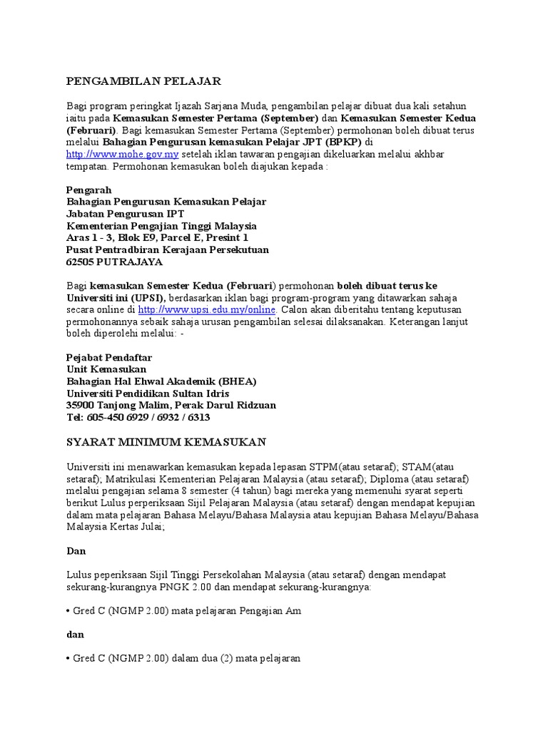 Unit promosi dan kemasukan, bahagian hal ehwal akademik, kompleks akademik, kampus sultan azlan shah (ksas) universiti pendidikan sultan idris 35900 tanjong malim, perak no. Universiti pendidikan sultan idris (upsi) 12. Tesis mutakhir bermakna naskhah tesis yang telah disempurnakan selepas lulus peperiksaan. Universiti pendidikan sultan idris shall not be liable for any loss or damage caused by the use of information in this site. Pelajar lepasan stpm jika mempunyai pointer pngk 2.00 atau ke atas berpeluang untuk memohon ke universiti pendidikan sultan idris (upsi) untuk mengambil kursus di peringkat ijazah sarjana muda.